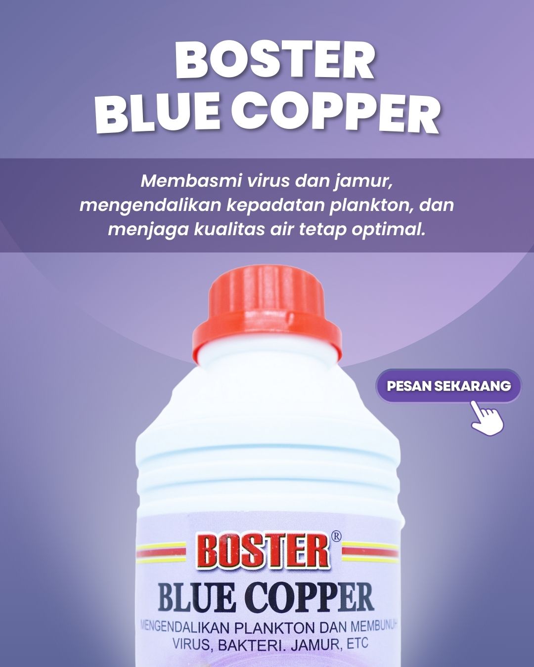 LARUTKAN BOSTER BLUE COPPER DENGAN DOSIS 1 PPM DAN AIR SECUKUPNYA, TEBARKAN MERATA KE KOLAM. SEMPROTKAN BOSTER BLUE COPPER SEBANYAK 5 ML PER 2 LITER AIR KE PERMUKAAN KOLAM.
